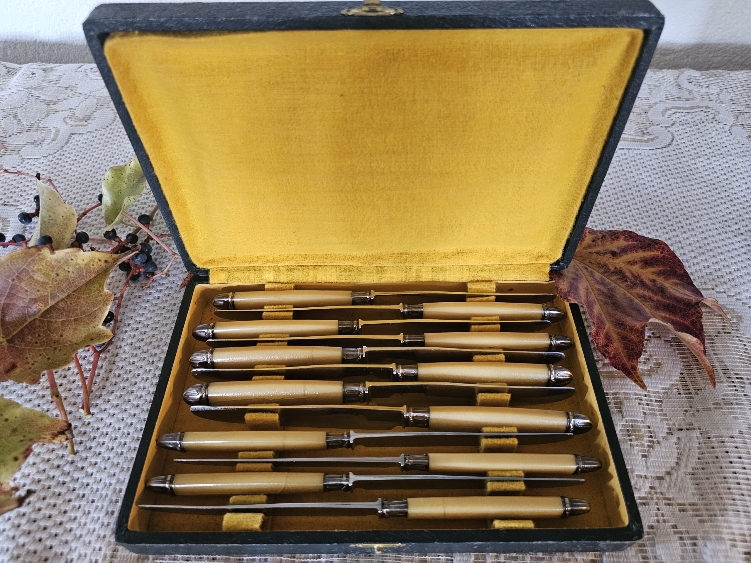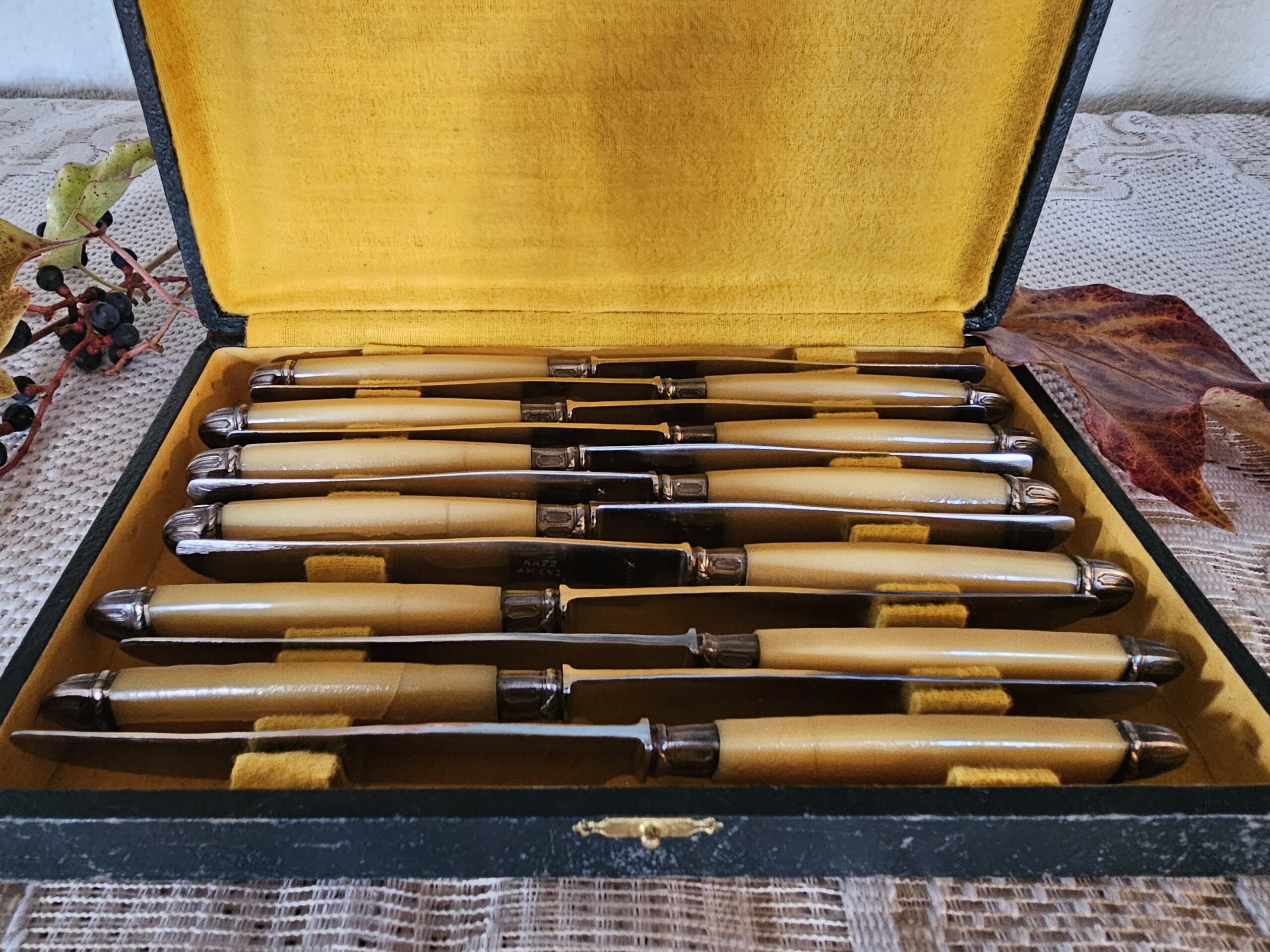 Ce coffret ancien renferme un élégant ensemble de couteaux dotés de manches couleur ivoire marbré. Leur aspect lisse et lumineux, associé à des garnitures métalliques décorées, apporte une touche de charme et de sophistication à vos repas.