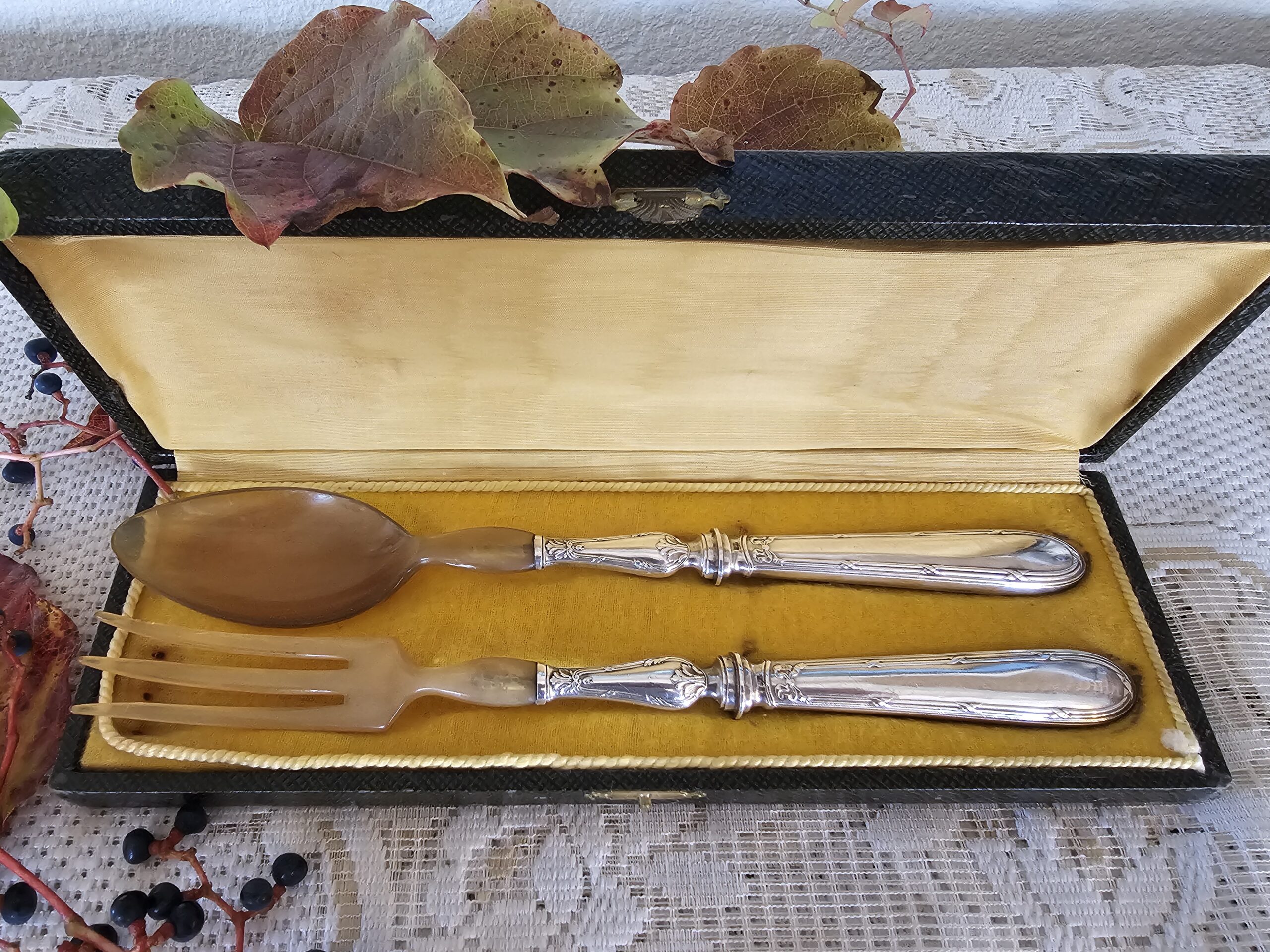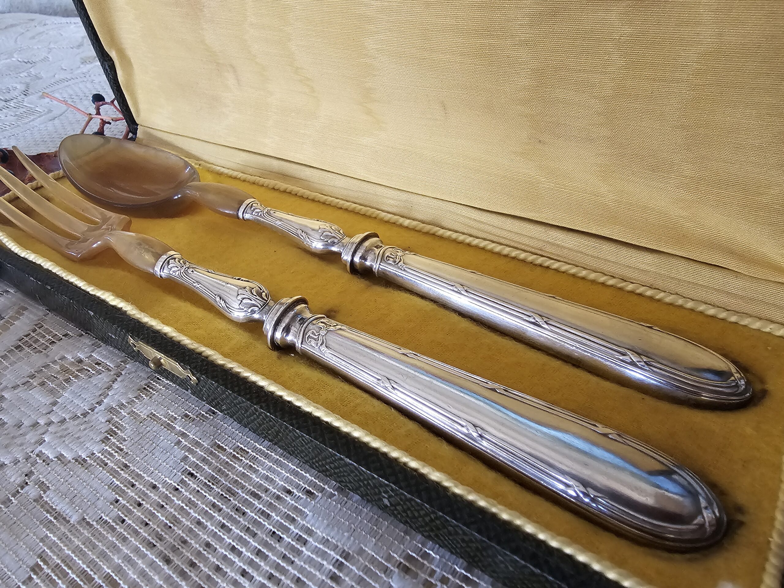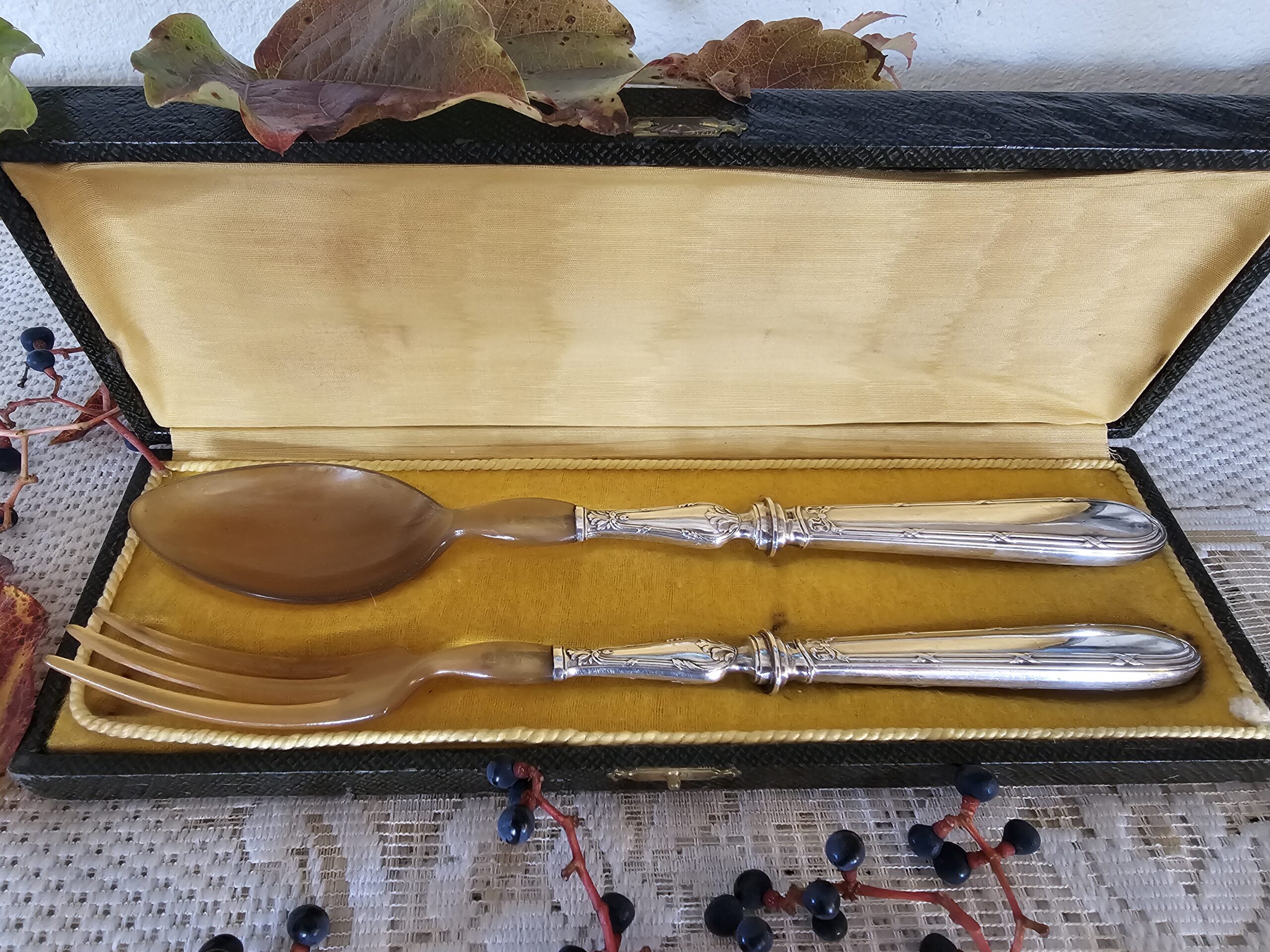 Couverts à Salade Anciens en Argent Travaillé et Corne