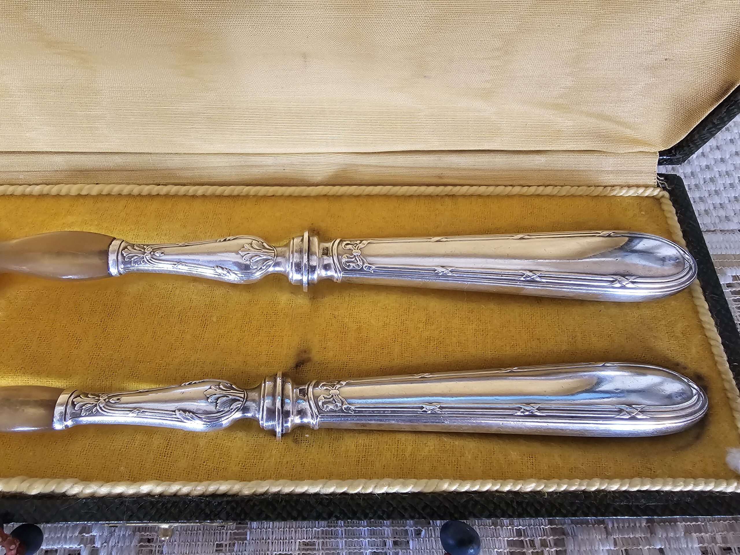 Ces superbes couverts à salade anciens associent des manches en argent finement travaillé à des parties fonctionnelles en corne naturelle. Un ensemble précieux, plein de charme et de caractère, idéal pour donner une touche d’élégance vintage à votre service de table.