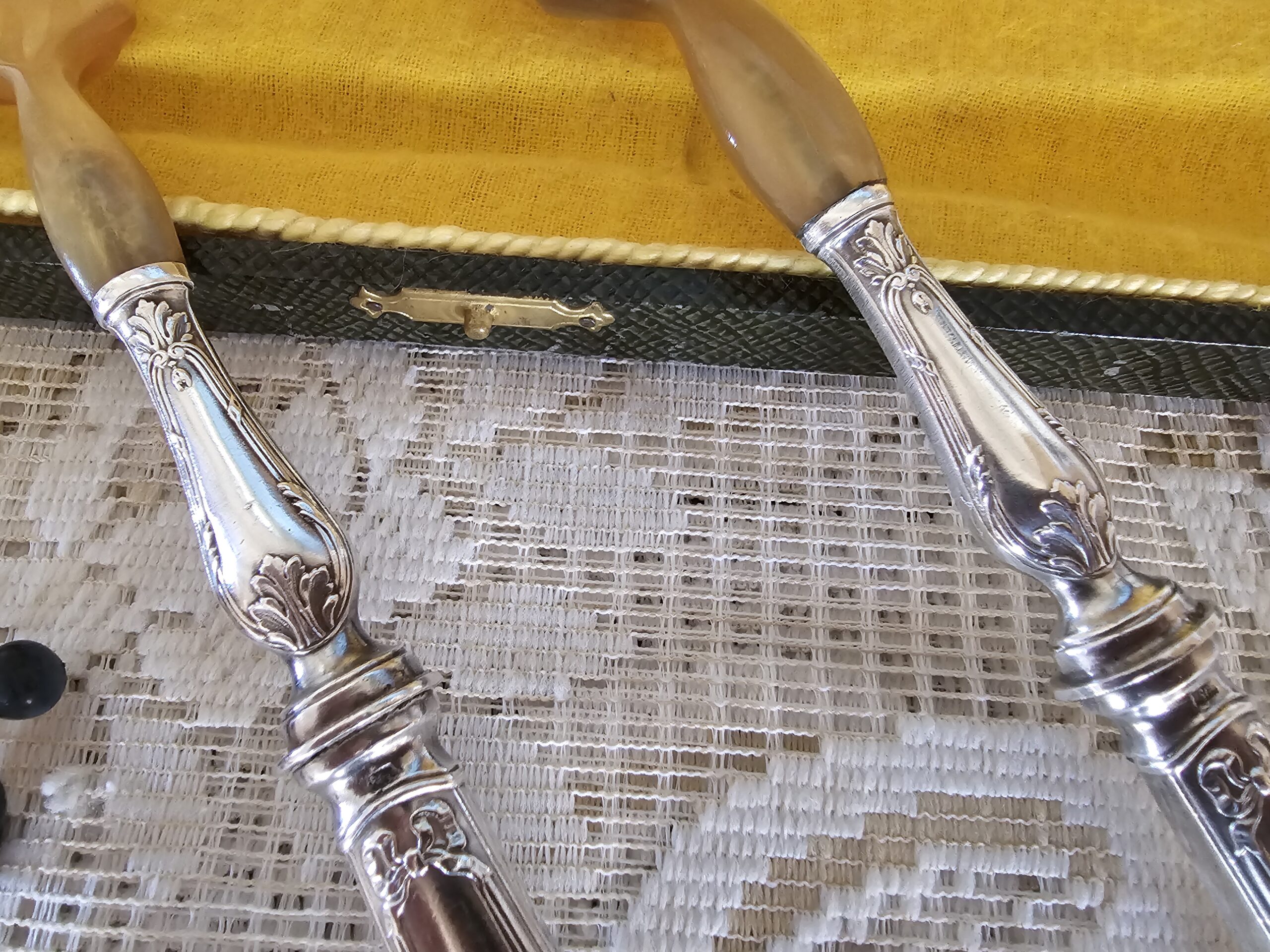 Décor : manches en argent travaillé, parties en corne