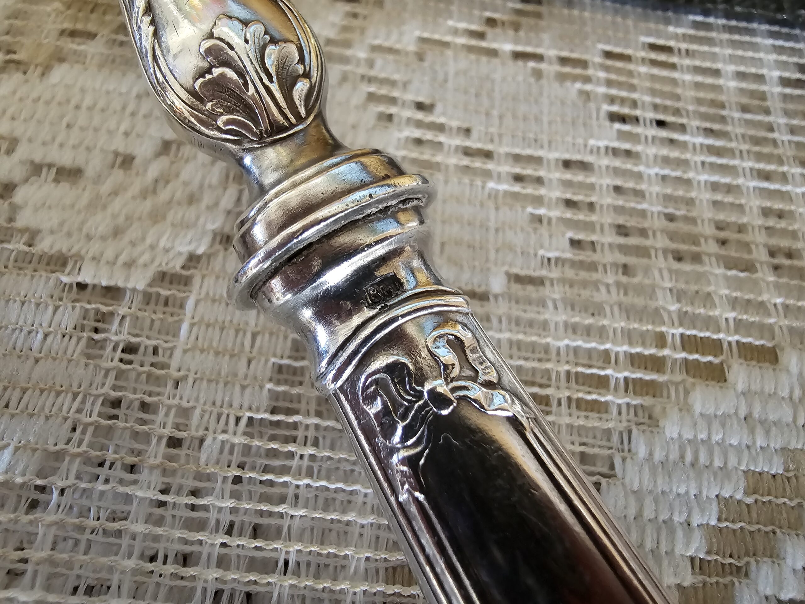 Les manches, entièrement réalisés en argent, présentent un travail ciselé raffiné. Le poinçon apposé garantit la qualité du métal et atteste du savoir-faire de l’orfèvre qui les a créés.