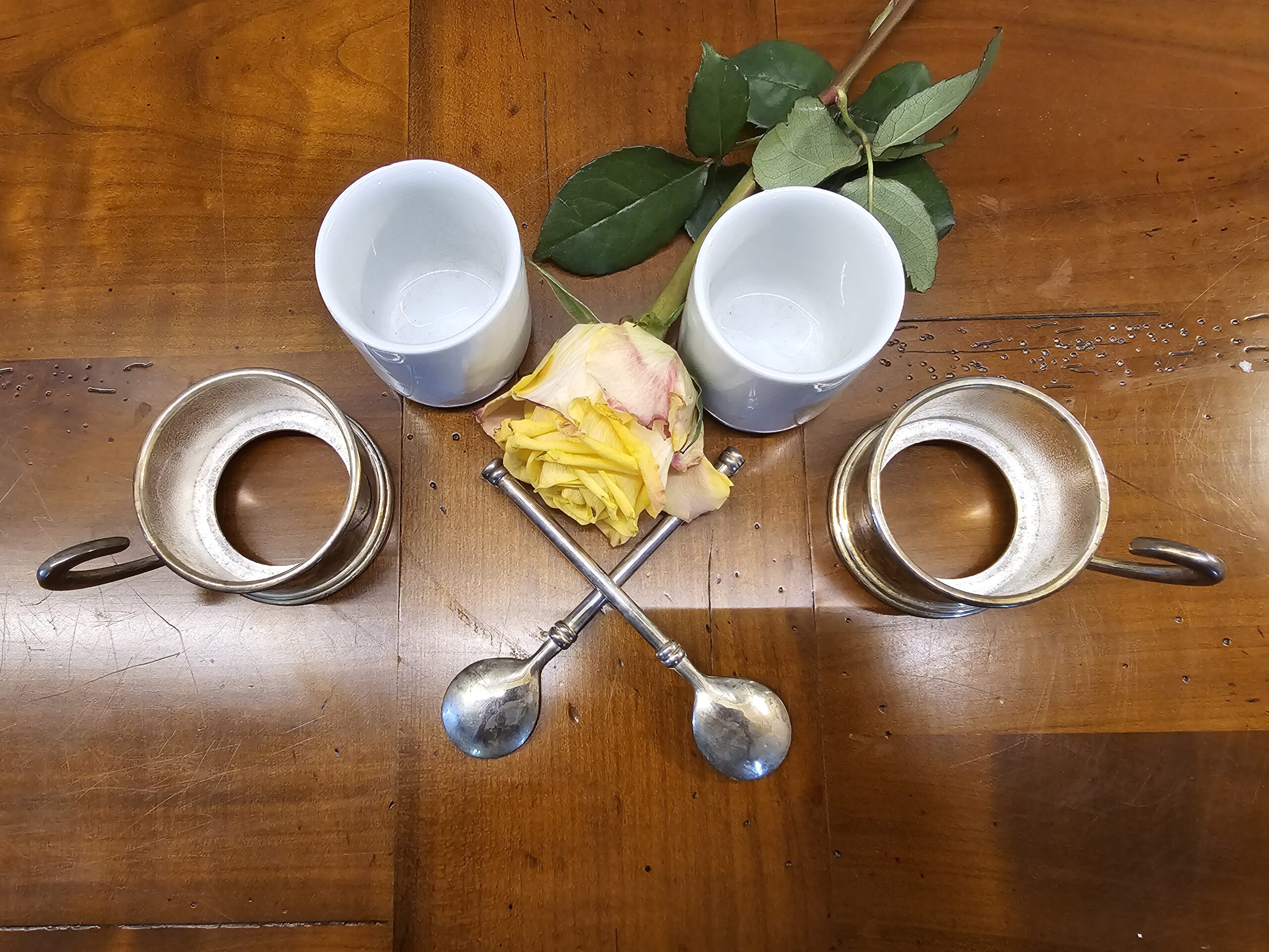 Les contours arrondis, la brillance du métal et la douceur de la porcelaine offrent un contraste délicat. Chaque détail, du manche galbé des porte-tasses à la finition des cuillères, témoigne d’un savoir-faire artisanal de qualité.