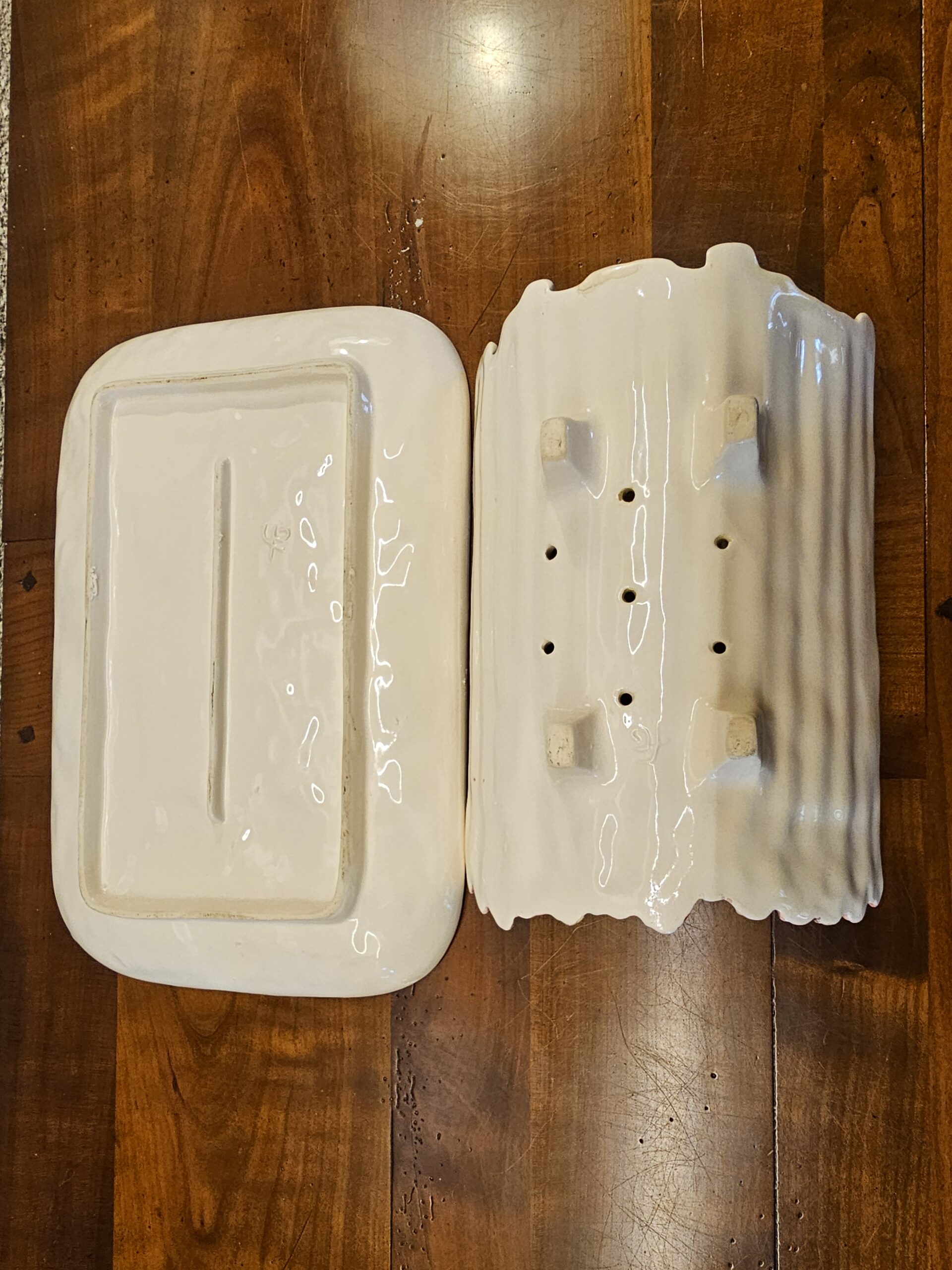 Dimensions : plat : longueur : 30 cm, largeur : 21 cm, égouttoir : longueur : 23 cm, larguer : 17 cm, hauteur : 8 cm