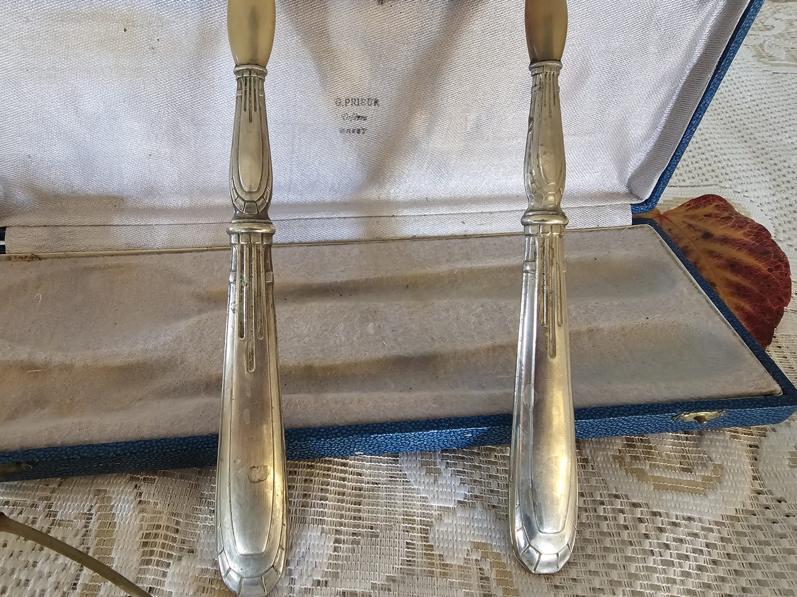 Chaque manche présente des détails délicats, typiques du savoir-faire d’époque. Le coffret d’origine, doublé de tissu, témoigne de l’attention portée à la présentation et à la conservation de ce duo.